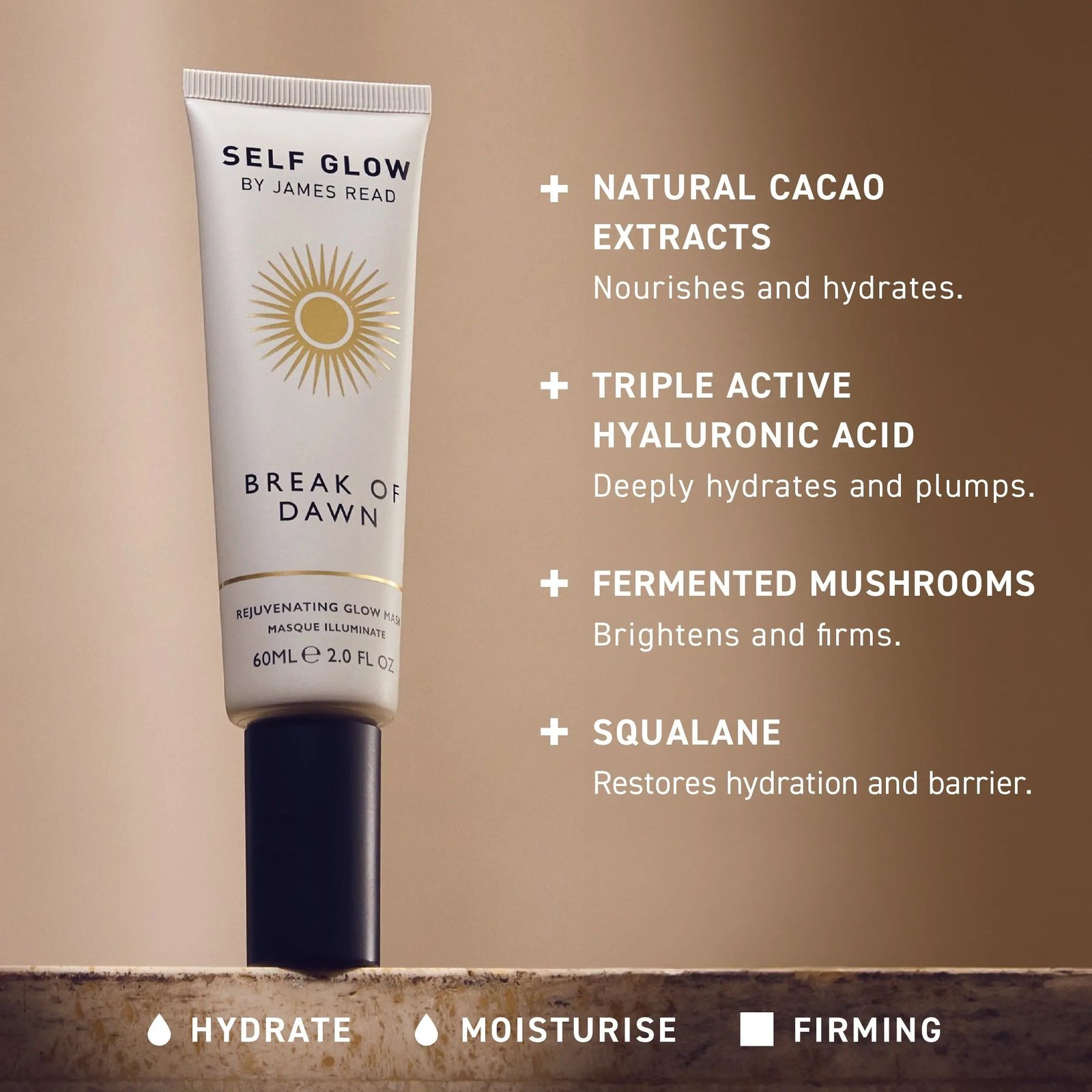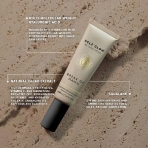 This multi-molecular weight hyaluronic acid rejuvenating self tan mask, blended with squalane, natural cacao extract, fermented mushrooms, aloe Vera, vitamin E, and a touch of natural plant-based DHA, helps hydrate the skin instantly and promotes a radiant, healthy-looking complexion within minutes. Pre-makeup, SPF or skincare 20 minute mask.